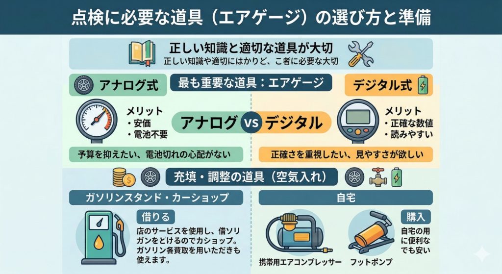 自分で空気圧の点検・充填を行うには、正しい知識と同じくらい適切な道具の準備が大切です。